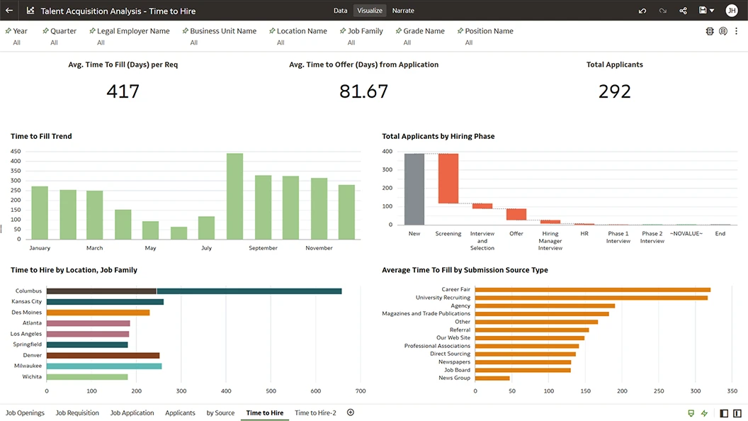 Assess the operational efficiency of your recruiting process—by business unit, department, and job family—with KPIs, such as time-to-hire, fill rate, and time-to-fill.