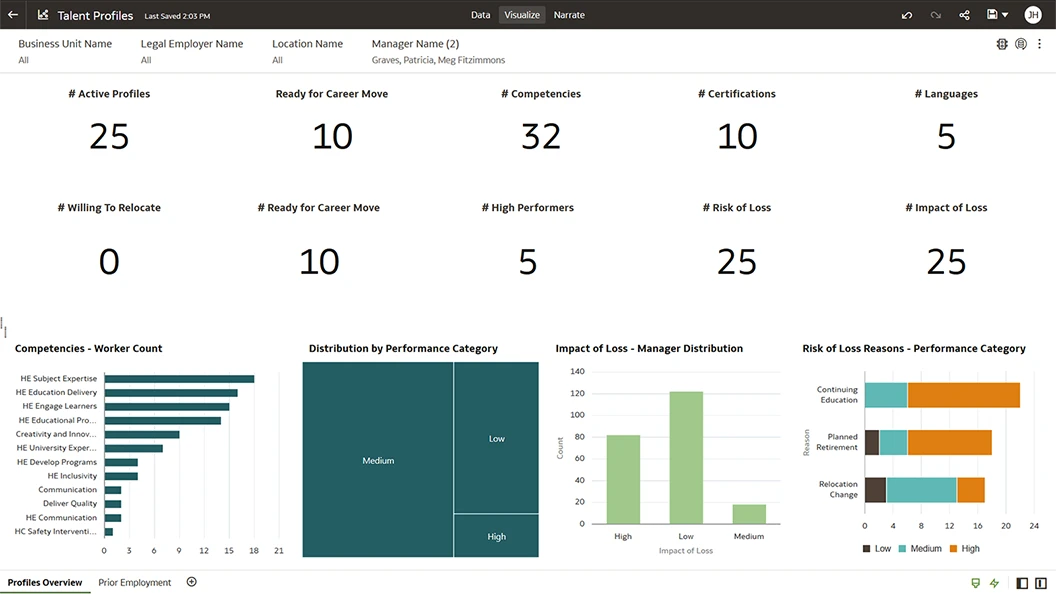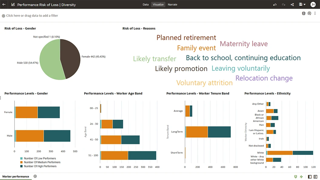 Increase visibility across all HR processes, including recruiting, attrition, employee engagement, skills, talent, absence, compensation, and more, with best practice key performance indicators (KPIs).