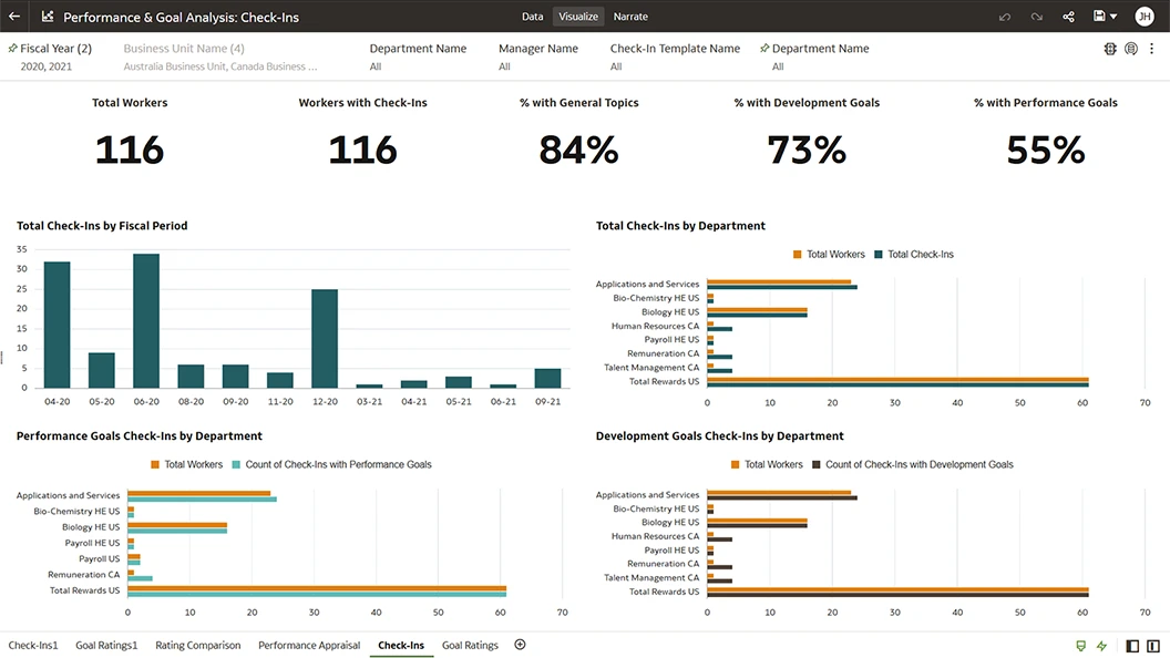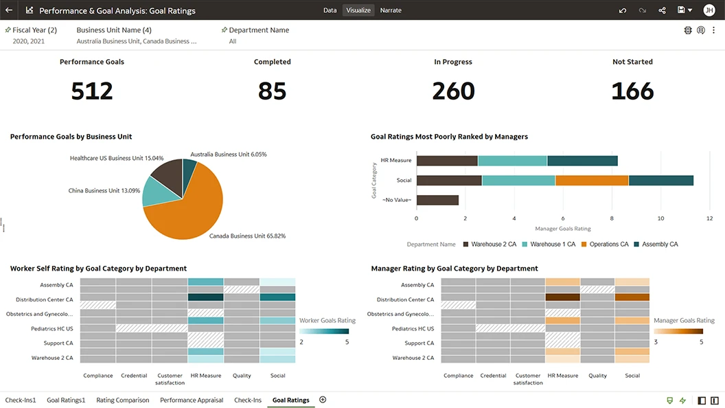 Track goal attainment to understand how well departments, business units, and regions have aligned performance goals with business goals.