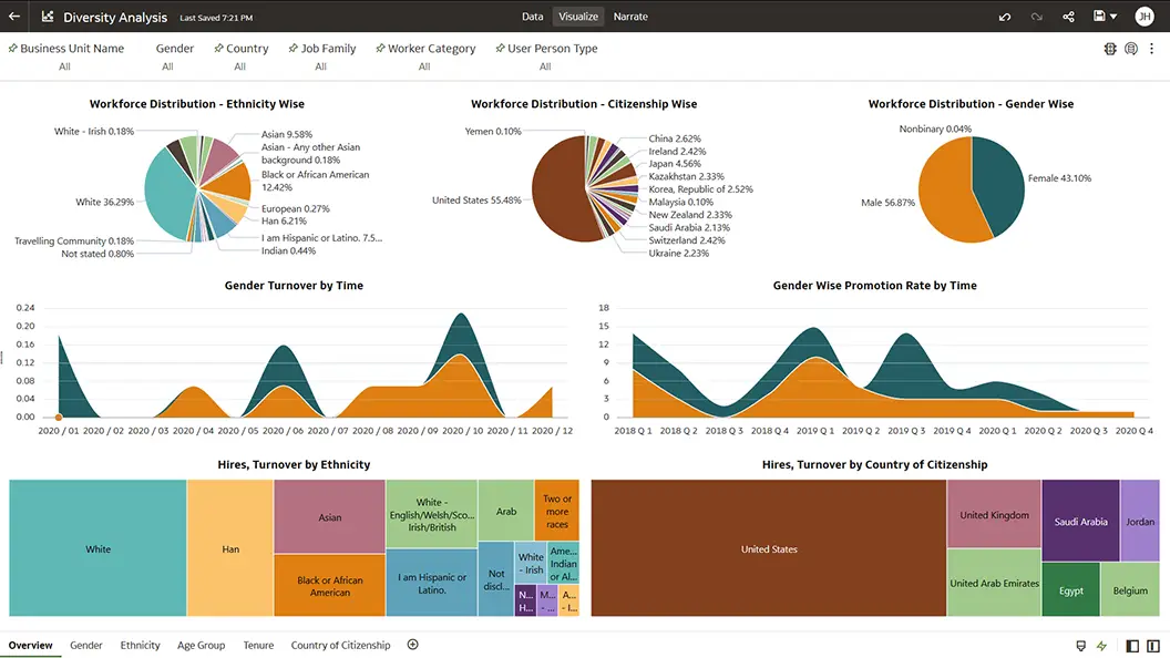Analyze various facets of diversity, such as employee gender, pay grade, ethnicity, tenure, age, country of employment, and more against organizational goals.