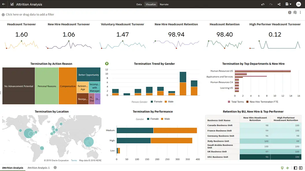 Increase visibility across all HR processes, including recruiting, attrition, employee engagement, skills, talent, absence, compensation, and more with best practice prebuilt key performance indicators (KPIs).