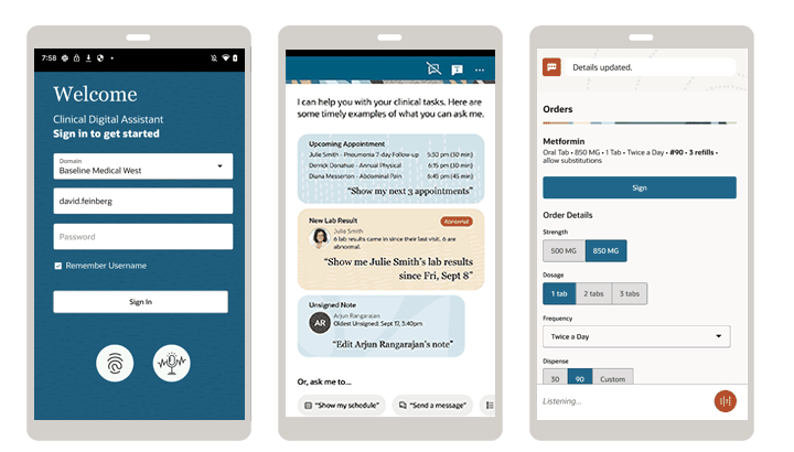 Physicians will have access to a new holistic multimodal voice-first mobile assistant that can help lower documentation time on a computer and enable physicians to have more focused patient interactions. v combines clinical automation, note generation, integrated dictation, and proposed actions in a single unified experience. As a personalized assistant to physicians, this solution will come equipped to retrieve information through voice commands, provide pre-visit patient insights, and generate well-structured clinical notes using AI to help accelerate physicians’ workflows. Oracle Health Clinical AI Agent is based on the Oracle Digital Assistant platform, uses speech, language, and generative AI capabilities to enhance clinical end user workflows, and is directly integrated into the EHR.