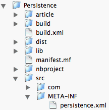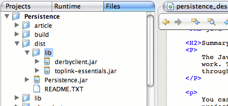 In this figure, notice that the dist directory contains the Persistence.jar file and a lib subdirectory. The reference implementation files toplink-essentials.jar and toplink-essentials-agent.jar are inside the lib subdirectory. You should consider putting other necessary libraries in the lib subdirectory too. For example, this project used the Java DB database client, which is in the file derbyclient.jar. For more information about how to use Java DB or Derby as your desktop embedded database, please read the article Using Java DB in Desktop Applications.