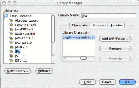 NetBeans 5.5 and later versions already have an installed version of the reference implementation, which is called Toplink Essentials. If you want updated versions of this library, however, you can use these instructions to add the library to your environment. The simplest way to accomplish both goals is to use an integrated development environment. NetBeans or Eclipse are both examples of popular IDEs that will help you include the provider implementation jar files in your compiler and JRE classpaths. The following examples use the NetBeans IDE, but you will use similar steps regardless of your IDE choice.