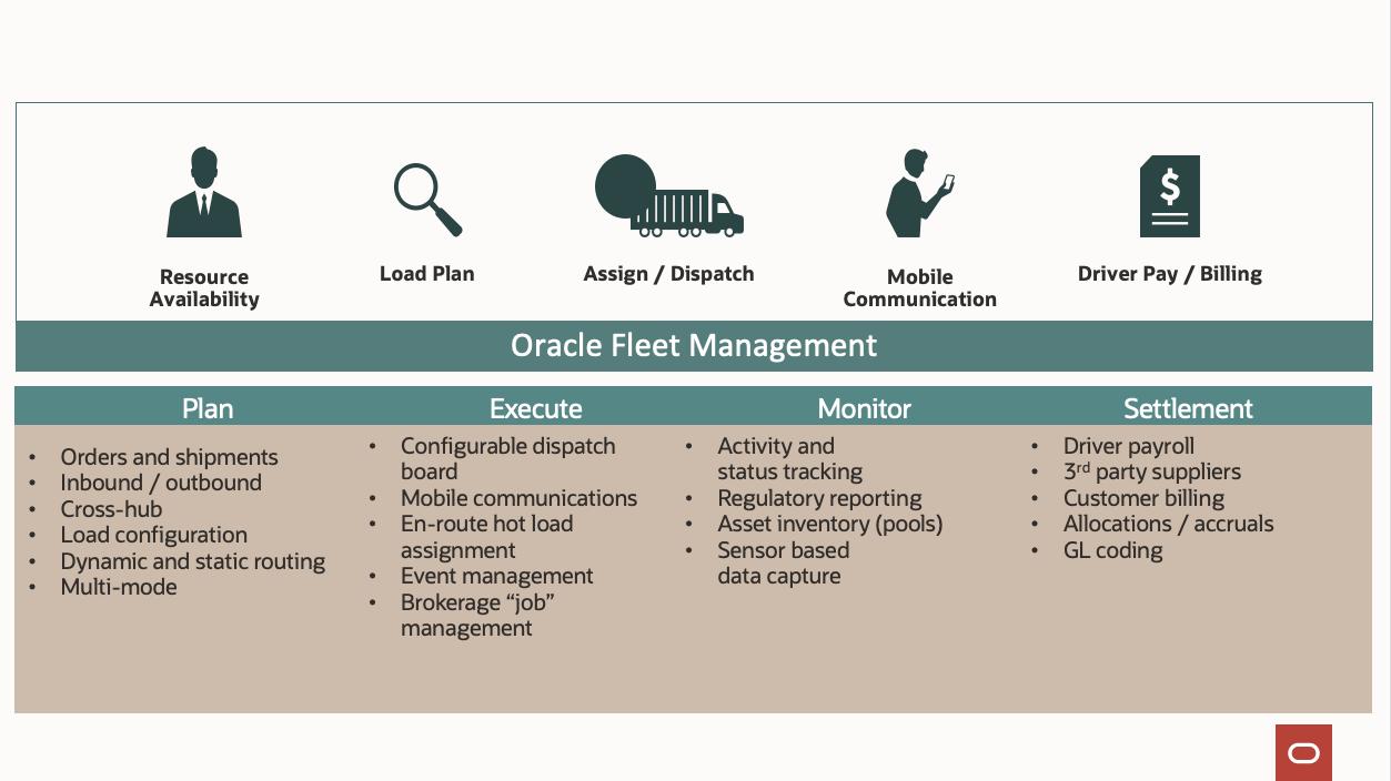 Oracle Fleet Management hem özel hem de özel filo kaynaklarını yönetmek için kapsamlı özellikler sunar. Bu yaklaşım, tek nakliye bütçenizi tüketen birden çok taşıma sistemine sahip olma ihtiyacını ortadan kaldırır.